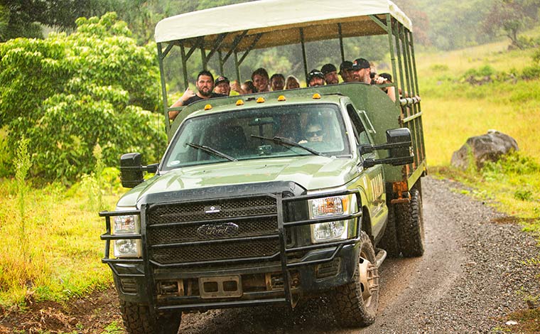 特に人気なのは「映画ロケ地ツアー」。広大な渓谷に点在する撮影スポットを、サファリスタイルのジープで巡ります。このジープは、バスよりも開放感があり、360度の景色を楽しめるため、クアロアの風景をより満喫できます。車内から壮大な景色を楽しめるため、アクティビティが苦手な子どもやシニアでも安心して参加できます。