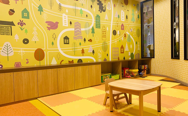 5歳以上のお子様は、キッズルームも利用可能です。やわらかい雰囲気の動物や花の愛らしい壁紙に彩られた3畳ほどのスペースは、学べるおもちゃを中心に遊び道具がたくさん揃っています。モニターもあり、フロントスタッフにリクエストいただくと動画の視聴が可能です。