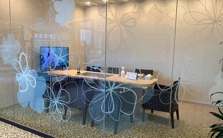 日比谷マリンビルを9階に上がり、エレベーターから一歩出るとシンプルで居心地の良いエントランスがお出迎え。ハワイアンミュージックが流れるゆったりとした雰囲気の中でリラックスした時間を過ごせます。開放的な窓から日比谷公園を見渡せます。プライバシーが保たれた個室ブースでゆったりと販売説明会が始まります。ベビーカーも入る個室ブースは、乳幼児連れのご夫婦にも安心です。