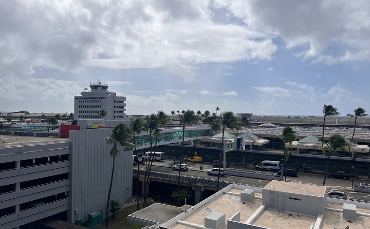 スカイラインが到着するまで、ハワイのやさしい風に癒されながら、空港の景色を楽しみましょう。