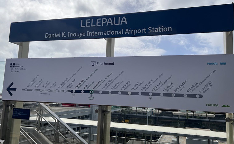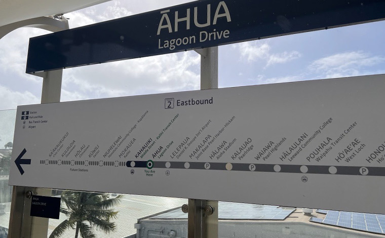 スカイラインは、ダニエル・K・イノウエ国際空港駅(LELEPAUA)から出発します。ザ・バスを乗り継げるラグーンドライブ駅は東行きのためEastboundの2番ホームで待ちます。