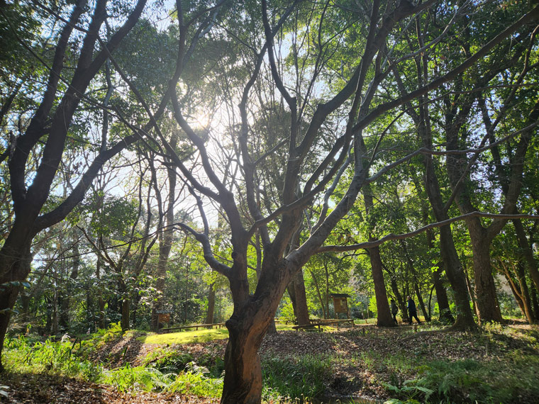 ケヤキ、エノキ、ムクノキなどの広葉樹が中心の「糺の森」。新緑の季節になると、瑞々しい青葉にあふれ、森林浴にも最適です。今回訪れたのは3月上旬でしたが、枝の間からやわらかな光が差し込む森の中で、ぼーっとできました。落葉樹の葉が芽吹く頃には、さらに若々しい緑が生える風景が楽しめます。