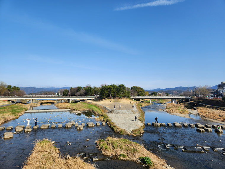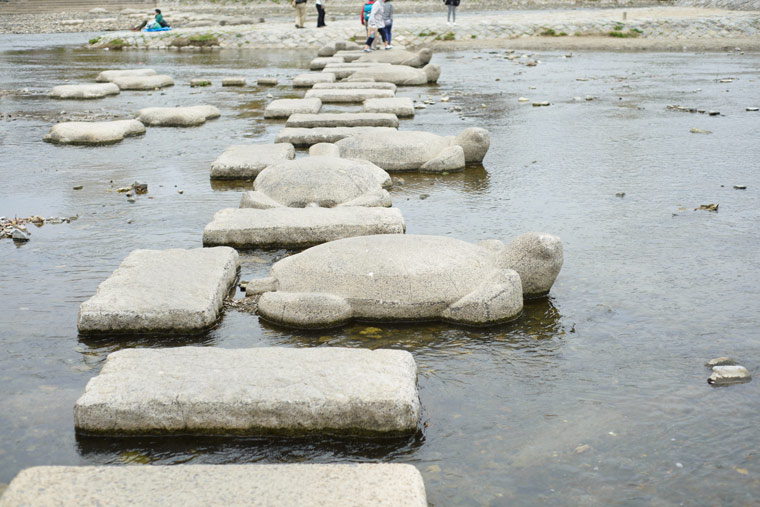 軽やかに飛ぶように渡る子ども達に比べて、思ったよりも石の間隔が広いからか慎重に歩く大人との対比がほほえましく、京都市民の日常と観光が重なり合う場所と言えるでしょう。