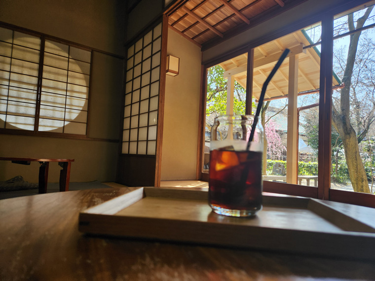 「Coffee Base NASHINOKI」は、京都御所から移築され茶室として使われていた建物を改装したカフェ。畳の室内で庭を眺めてくつろぎながら、染井の水を使った「水出しコーヒー」を楽しめます。